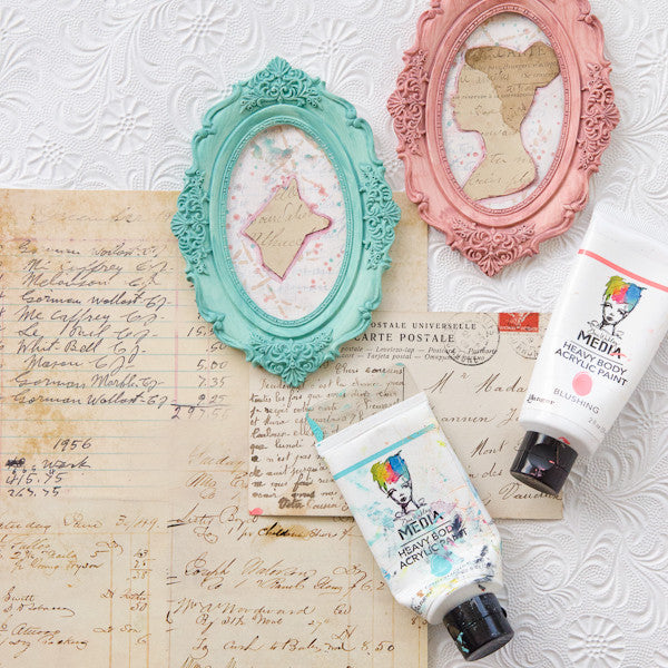 Mix Blushing and Turquoise paint with a beige paint to mute the colors a bit. Brush one frame with pink paint mixture, and the other with the turquoise paint mixture. To add even more distressed details, dip the paintbrush in water and go over the painted surface to allow some of the white of the frame to show through.