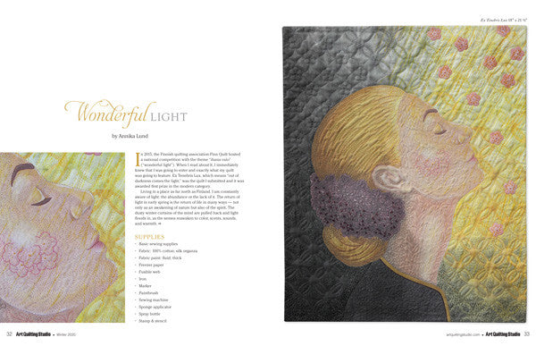 Cozy up with the winter edition of Art Quilting Studio and the variety of quilted features found in every shape, style, and color. Whether you stitch by hand or machine, with fabrics or paper, we hope you’ll join us on this journey where everyone is invited to experience the joy of quilting within the pages of Art Quilting Studio.