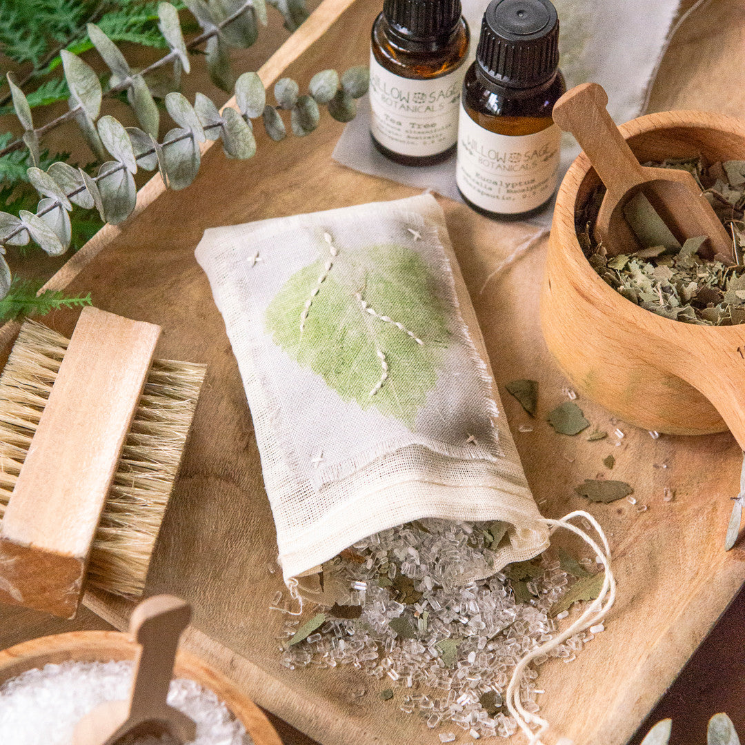 To make the salts, add 1½ cups of Epsom salt, 10 to 20 drops of eucalyptus essential oil, 10 drops of tea tree essential oil, and dried eucalyptus to a sealable plastic bag. Seal the bag and shake it to combine all of the ingredients. Set this aside.