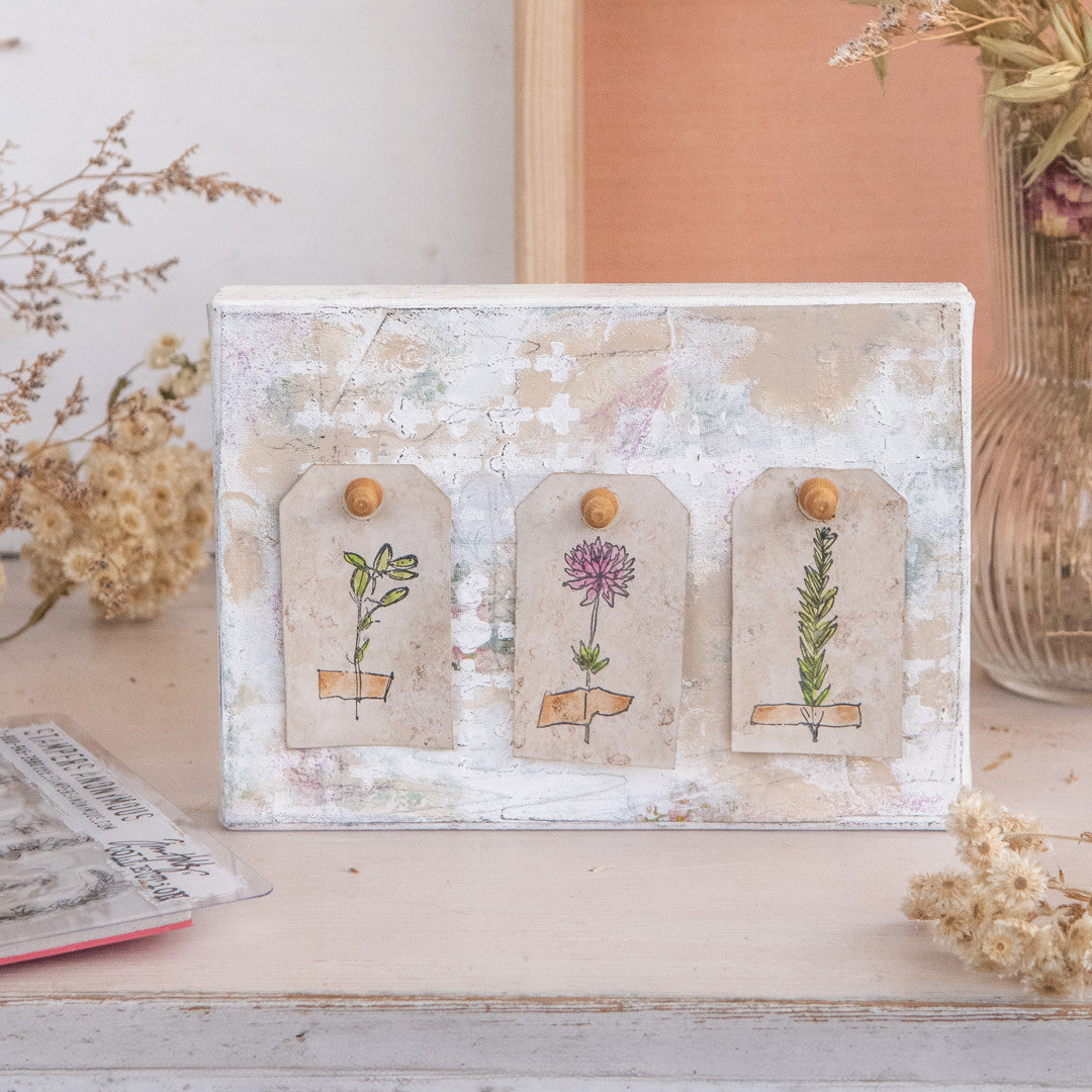Another product I’ve been wanting to play with is the set of Worn Wallpaper Scraps, and I thought they’d pair nicely with the stamps. To begin, I tore the Worn Wallpaper Scraps into smaller pieces, and adhered them to a canvas using gel medium. When the gel medium dried, I applied washes of white and crème acrylic paint the canvas. I then applied white paint through a stencil to give everything a bit more texture. I still felt like the canvas needed a little something extra, so I quickly scribbled on it with a pink oil pastel as well as a charcoal stick. I stamped two more images onto stamps and colored all of the images in with watercolors. The tags were two white for my liking, so I submerged them in a coffee bath for about 20 minutes, and then sprinkled coffee grounds onto the tags. Once dry, I brushed the grounds off the tags to reveal a mottled effect I really enjoyed. To finish, I used wooden pushpins to attach the tags to the canvas. With so many fun designs in the Forgotten Garden Cling Mount Stamp set, I’m eager to make another specimen board on an even larger scale.