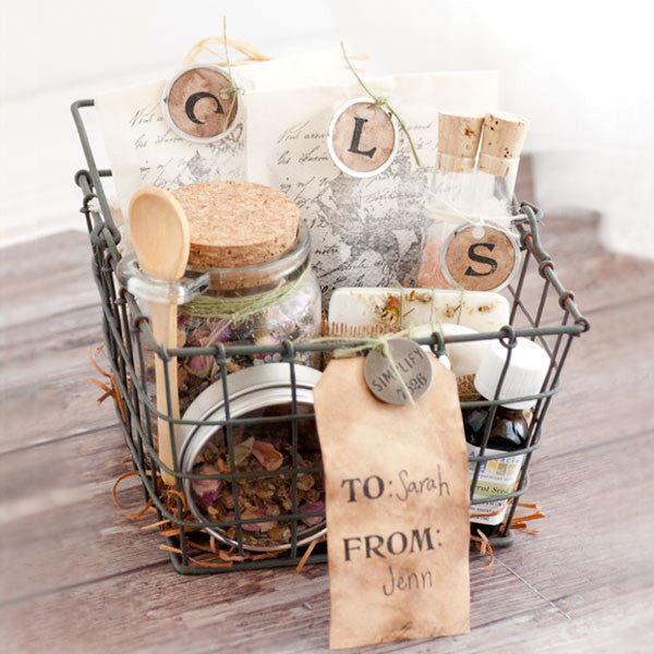Fill glass jar with salt and herbs of your choice, such as rose buds, chamomile flowers, Dead Sea salt, Pink Himalayan salt, and Epsom salt. Wrap jar with green jute to coordinate with the rest of the bundle.
