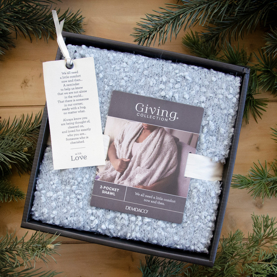 While this shawl is luxuriously soft, it is not too heavy, so you can wrap yourself in comfort any time of year. An inside pocket can hold a tissue, eyeglasses, or cell phone. This Dusty Blue Giving Shawl also comes beautifully packaged in its own gift box and includes a keepsake bookmark with a message of encouragement.