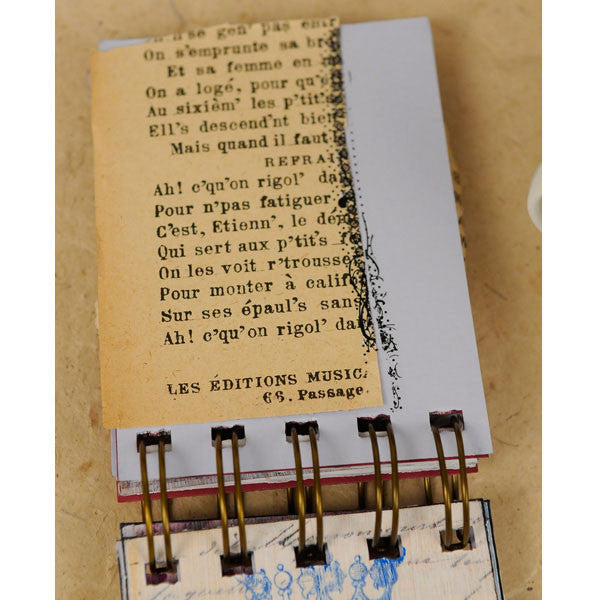 Add some simple strips of music paper and embellishments to complete the inner ATC pages. For the ATC that will be the cover, stamp the "Alice in Wonderland" stamp onto one of the ATCs that has the handwriting background design. Then trim about ¼ inch of the sides, ink the edges and glue onto a piece of coordinating colored cardstock. Use the rub-on tape runner to add the decorative edge vertically down the edges of the patterned paper and then add some vintage music or text paper the center. Add a small white keyhole using Diamond Glaze for adhesive.