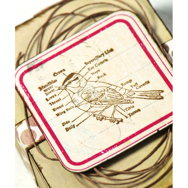 This quick and easy Easter favor box features the "Birds of a Feather" stampsand the ATC matchbox by 7gypsies! Begin by covering the inside (drawer) part of the box with the polka dot patterned paper from the Porcelain paper collection. Cover the outside of the box with a light brown paper. Ink edges of the drawer and the outside with brown ink. Cut a thin strip of the polka dot paper and glue it around the middle of the outside portion of the box. Take a long piece of brown scrapper’s floss and create the long oval circular shape like I have done and glue to the top of the box. Stamp the bird anatomy image from the Birds of a Feather stamp set onto the red tag from the Modern Romance kit using brown ink. Add some brown scrappers floss to the inside of the box and add some natural looking edible Easter eggs!