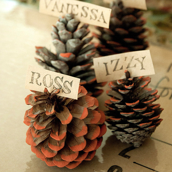 Using a paintbrush, lightly paint the ends of the pinecone scales and then allow them all to dry. While the pinecones are drying, you can start making your guests' name tags. Simply stamp their names onto kraft paper using the ABSeas stamp set and black ink, and then cut them into individual name tags. Now you're ready to tie the final look together. Find a crevice in each pinecone to insert your name tags. You can also matte the name tags onto a piece of cardboard for a sturdier look.