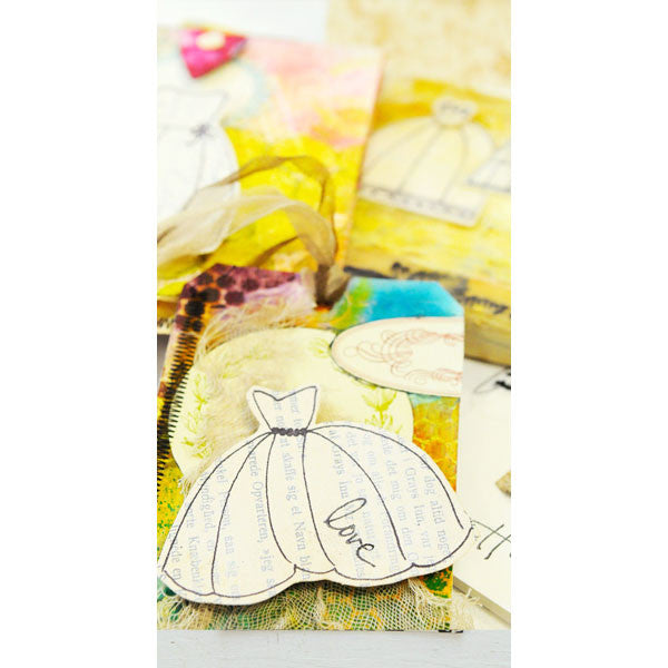 Begin by using spray inks and stencils to cover the front of a tag. Once dry, adhere a small piece of handmade paper to the bottom. Adhere stickers and cheese cloth to tag front. Using a zig zag stitch, stitch along the left side of the tag. Lightly brush gesso to the front of a piece of old book paper, adhere to a piece of card stock. Stamp dress image from and love image form to the paper and trim. Adhere to tag with double sided foam and add fibers to the hole in the top.