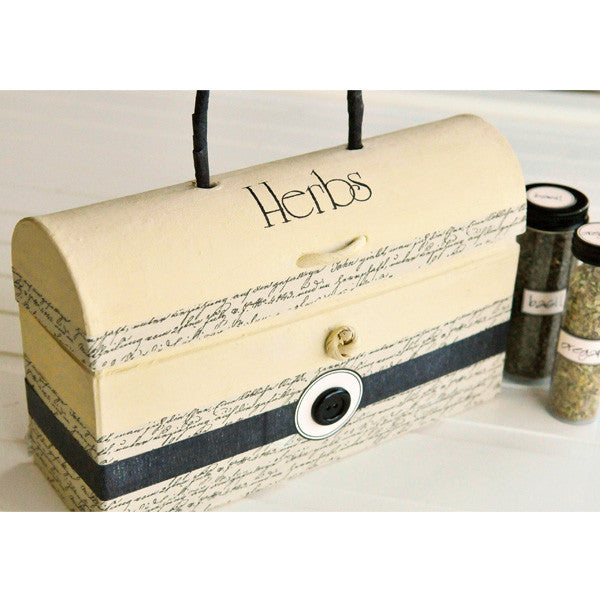 Start by painting a small paper mache lunch box with Sand colored acrylic paint. Once the paint has dried add decorative script tape to the outside of the box and one strip of black tape. Use the same black tape to wrap around the handle. Add the black circle sticker and a button to the front. Carefully stamp the "Herb" stamp onto the lid. Since it isn’t a flat surface to stamp on you basically have to “roll” the stamp to get a nice, crisp image.