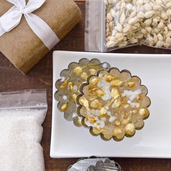 Makes six handmade soaps! For anyone in love with melt-and-pour soap making, this kit is a quick and easy project that can be made for yourself or to give as a gift. We've teamed up soothing Aloe Vera with jasmine flowers for an amazing floral aroma and Dead Sea Salts for exfoliation in this must-try soap recipe. The vintage tart tin molds will also give your soaps beautiful, fluted edges. You'll be able to assemble your own Handmade Jasmine and Dead Sea Salts in 5 minutes or less with the ingredients and step-by-step instructions provided inside this DIY kit.
