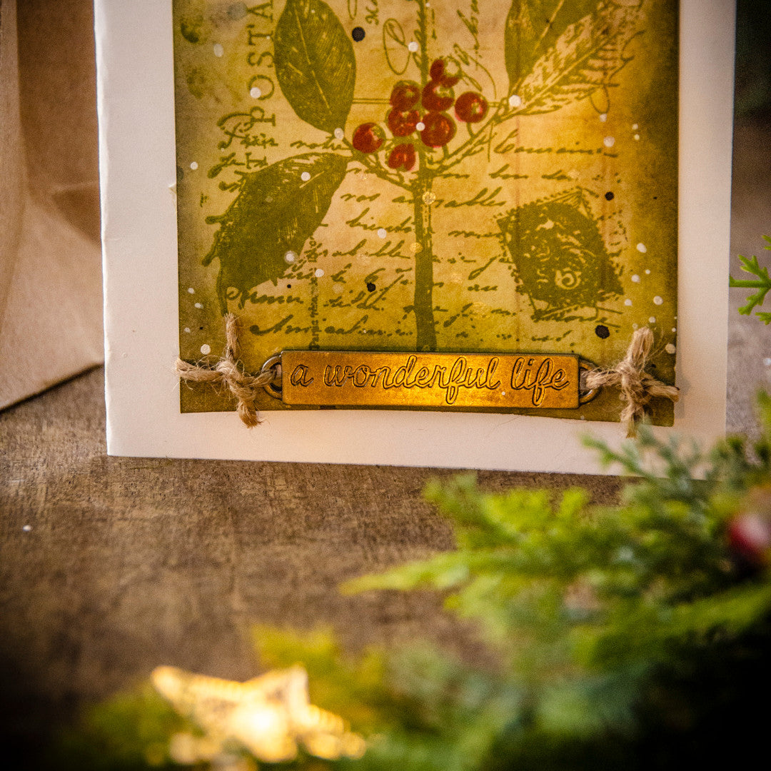 The Festive Collage Cling Mount Stamps by Tim Holtz make it incredibly easy to create a card that looks like it has a number of stamped layers, when there’s really only one. The key is to stamping the image onto something that already has a faint pattern, like the ledger paper I used here. First, stamp the image onto patterned paper. Use a sponge to apply various colors of ink to the paper. Apply ink to an old pencil, and stamp dots onto the paper. Color the berries with red colored pencil to add a pop of color. When happy with everything, splatter white and black paint or ink onto the paper. Attach a metal word tag using twine, and adhere the stamped paper to a folded card or gift bag.