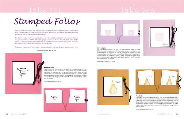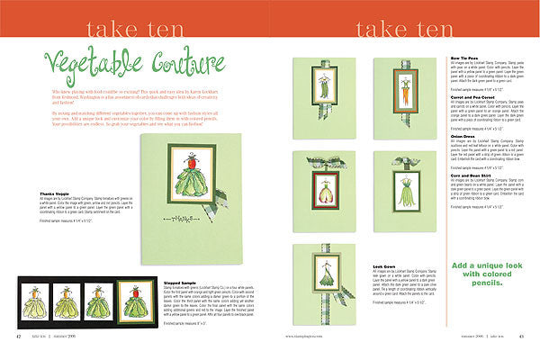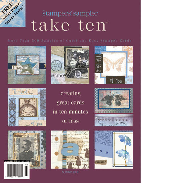 This issue of Take Ten features over 500 samples of quick and easy cards. Learn new techniques for making cards from a variety of inspiring articles and more than 50 pages of general cards. Guest Artist Linda Beeson works with a variety of style, trends, and techniques, creating everything from simple cards to elaborate collages. Learn how to make your own stationary sets like Toni Tessler in “Stamped Folios.” Ginger Leigh Grinkmeyer proves that polka dots never go out of style with her charming cards featured in “Polka Dots.”