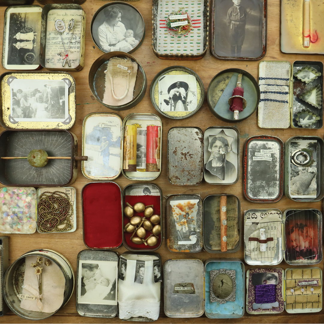 "Some of my favorite elements incorporated inside the tins this year were a found bird skull that I covered in words, a house entirely made out of blue shards, a fabric scroll held by a limpet, a wishbone carefully stitched to canvas, mica sheets, tiny frames, vintage jewelry, embroidery threads, and more found objects." — Jack Ravi